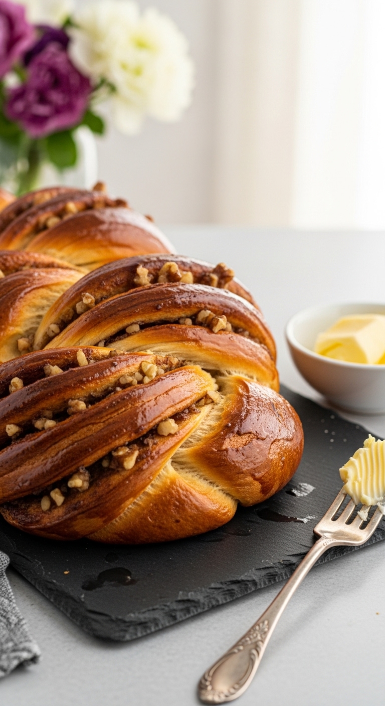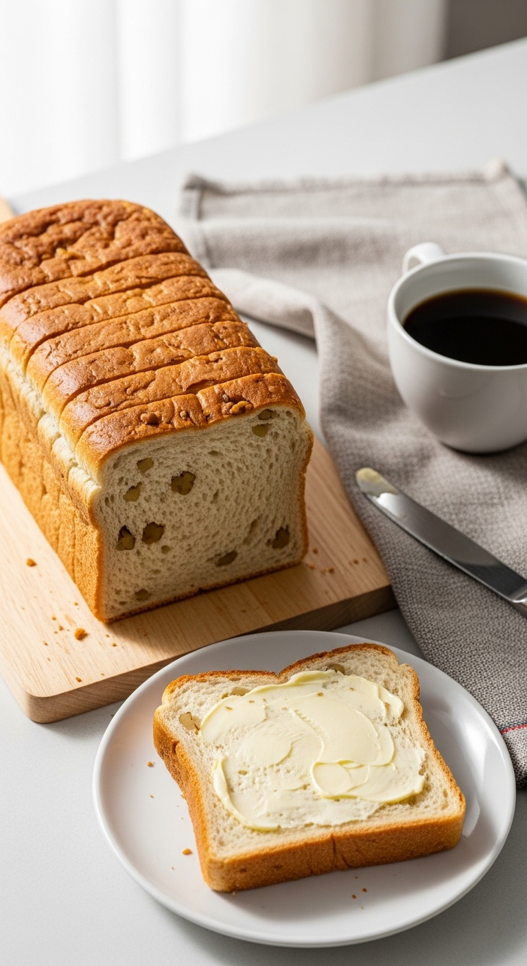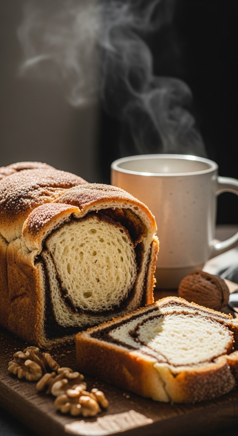 Serve sliced on a wooden board with a pat of butter. Garnish with a few toasted walnut halves and a light drizzle of maple syrup. Pair with black coffee or milky chai. Store wrapped at room temp for 2 days or freeze sliced for up to 2 months. For make-ahead, proof in the fridge overnight and bake next morning. This loaf is perfect for cozy weekend brunches.