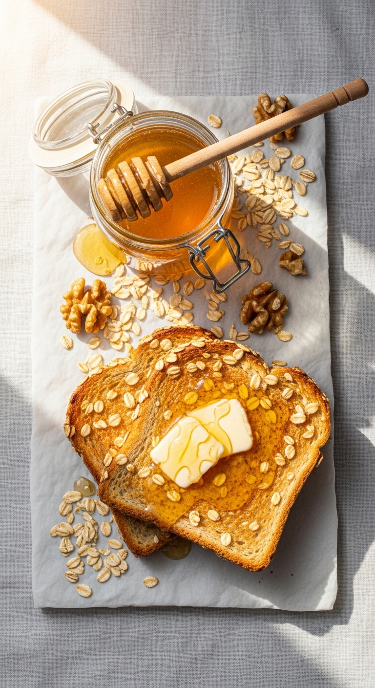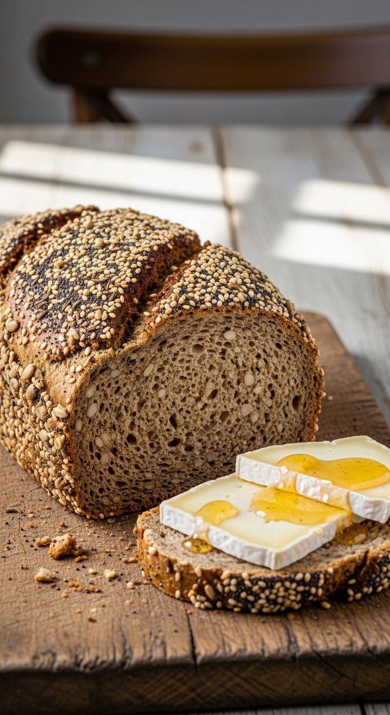 Use for sandwiches, French toast, or simple buttered toast. Garnish with sliced banana and honey for a quick breakfast. Store sliced in a bread box for 2–3 days or freeze slices. Make-ahead: slice and freeze for quick weekday toasts.