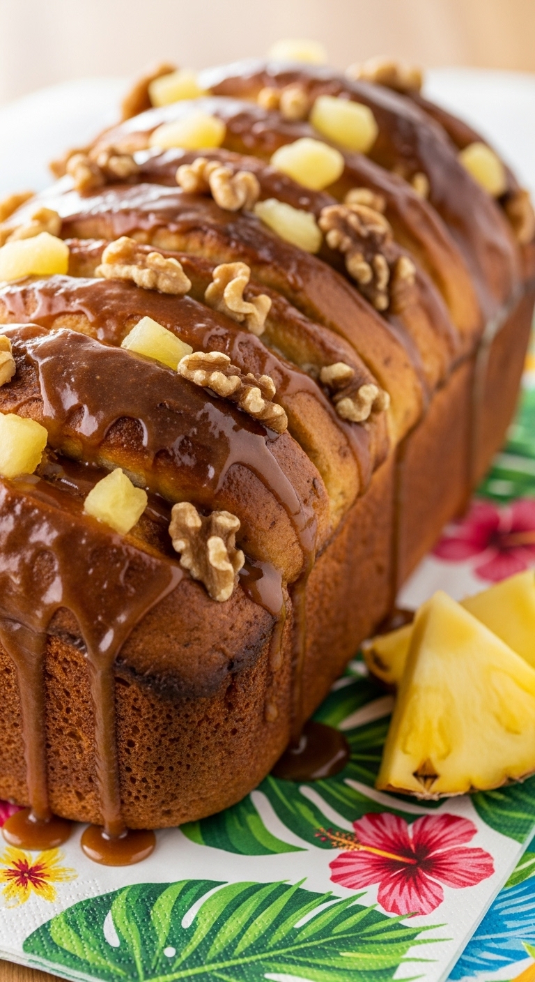 Serve with cream cheese or mascarpone and a light maple drizzle. Garnish with thin pineapple slices and toasted walnuts. Pairs with tropical fruit salad and coffee. Store covered at room temp for 2 days or refrigerate to extend freshness. Freeze slices for make-ahead breakfasts.