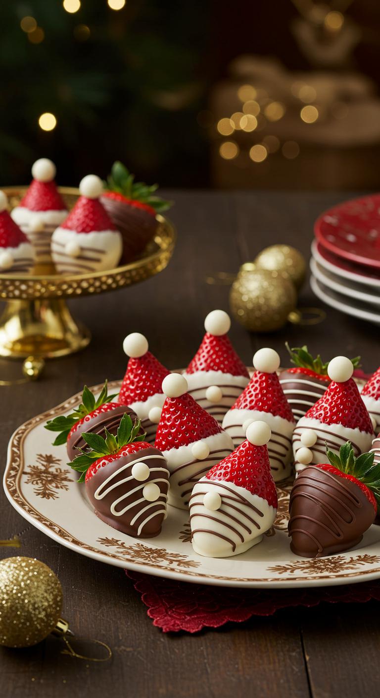 A festive, no-bake bite: strawberries turned into chocolate-ganache Santa hats — cute, quick, and totally shareable.