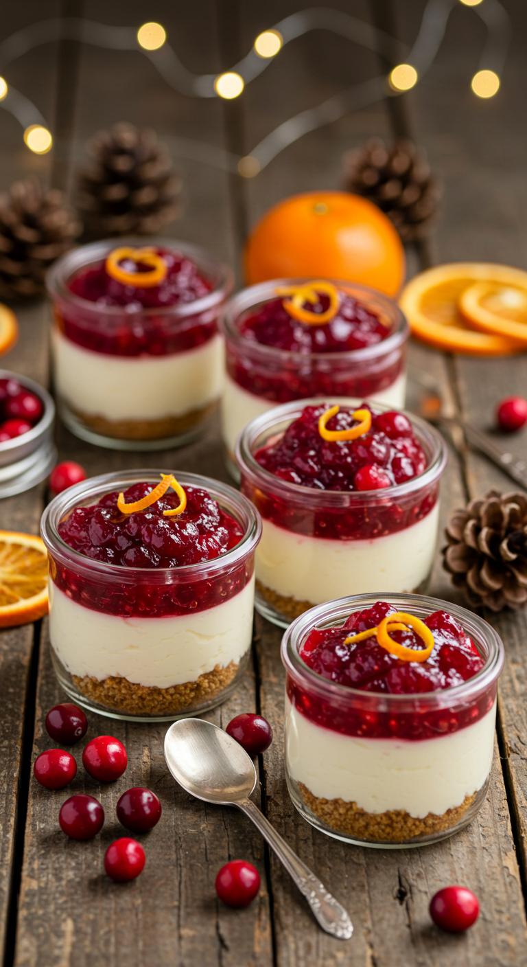 A festive, creamy no-bake cheesecake in a jar topped with bright cranberry sauce — perfect for holiday gifting or a cozy dessert.