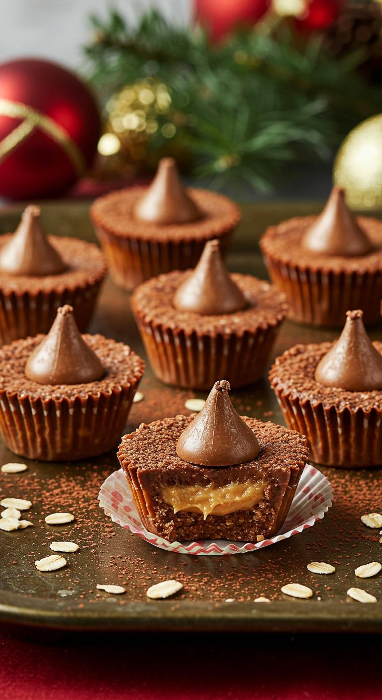 - Remove from the fridge and press one unwrapped Hershey’s Kiss into the center of each cup; the kiss will stick and slightly melt into the filling.