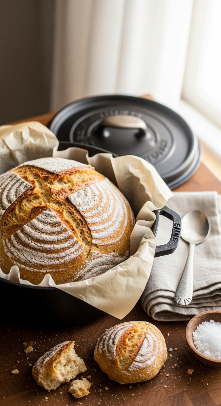 - Preheat oven 475°F (245°C) with Dutch oven 45 minutes. Score, bake covered 20 minutes, uncover and bake 18–22 minutes until golden and internal temp 200°F.