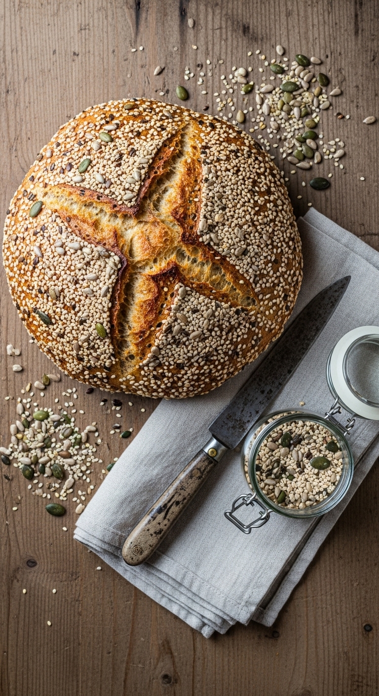 Slice and toast for nutty breakfast toast with ricotta and honey. Garnish with extra seeds and herbs for a rustic board. Pairs with jam, smoked salmon, or a creamy soup. Store airtight 2–3 days or freeze. Make-ahead: shape and refrigerate up to 48 hours for flexible baking.