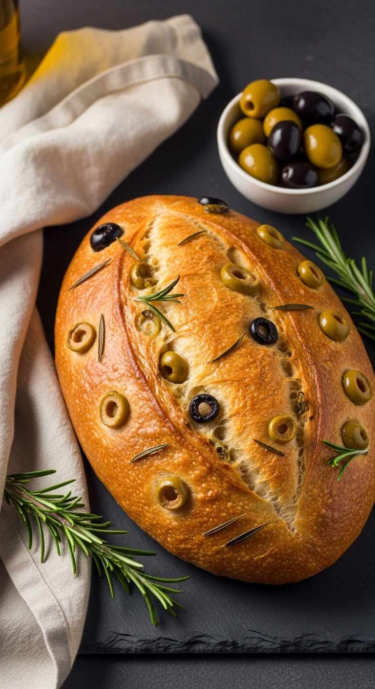 Slice and serve with olive oil for dipping or alongside feta and roasted veggies. Garnish with rosemary sprig and flaky sea salt. Pairs with roasted lamb or a crisp white wine. Keep wrapped at room temp 2–3 days or freeze sliced. Great for picnics.