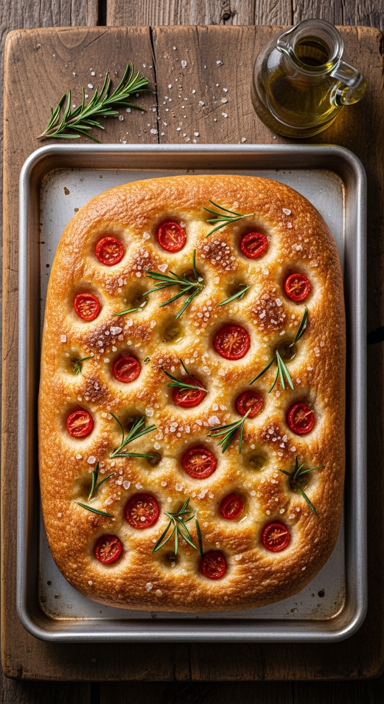 - Sprinkle rosemary, thyme, and cherry tomatoes. Cover and proof 2–3 hours until puffy.