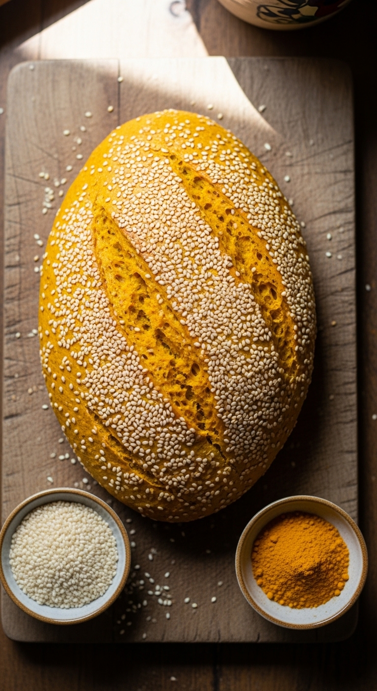 Turmeric adds warm color and subtle earthiness while sesame seeds bring toasty crunch. This loaf looks striking and tastes fragrant. It’s great for savory breakfast toasts or as a side for roasted vegetables. You’ll love the golden crumb and nutty finish.