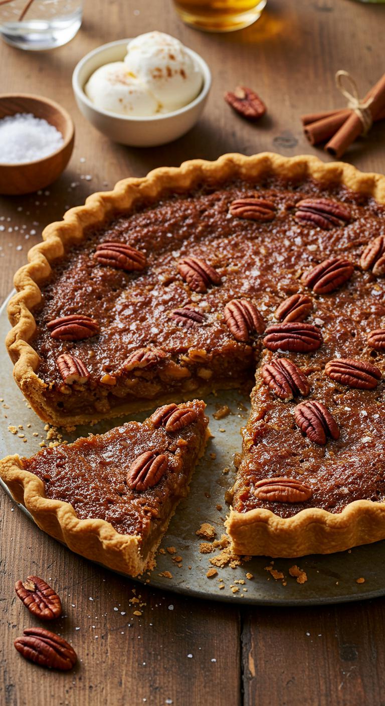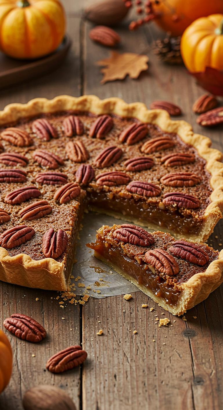 Enjoy a slice of cozy, maple-sweet pecan pie with a delightful cracked-cinnamon kick!