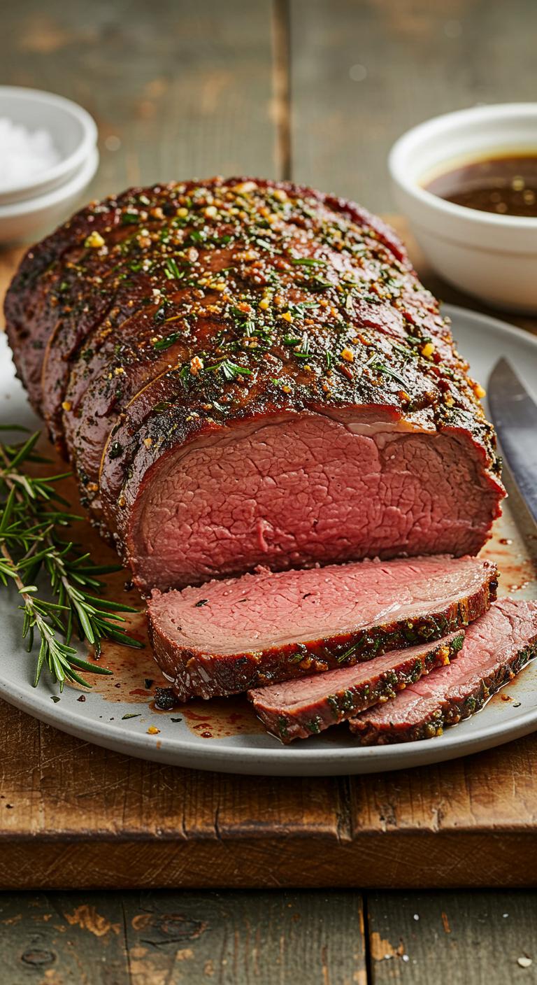 A glorious, savory prime rib with a crisp herb crust — perfect for holiday showstoppers.