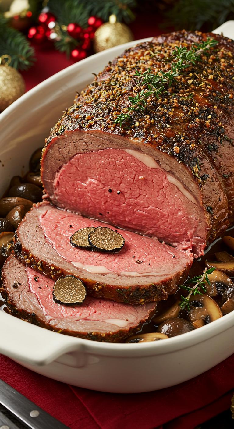 A luxurious, earthy prime rib elevated with truffle oil and a savory mushroom reduction — perfect for holiday showstoppers.