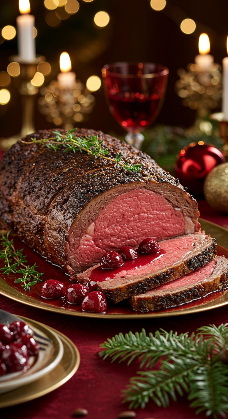 A rich, savory prime rib with a deep coffee-cocoa crust and a sweet-tart cherry-port sauce — perfect for a festive centerpiece.