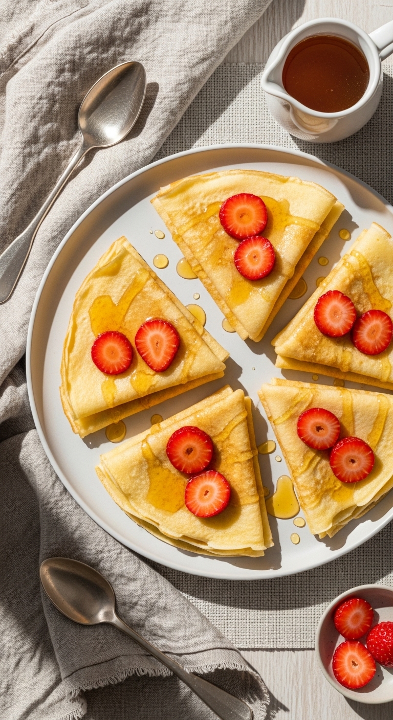 Fold or roll crepes and dust with powdered sugar or drizzle with honey. Fill with fruit and mascarpone or ham and cheese for savory. Store cooled crepes in the fridge up to 2 days, layered with parchment. Reheat gently in a skillet. Perfect for brunch, dessert, or dinner.