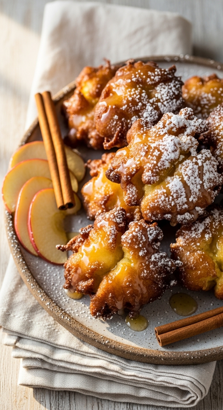 Serve warm with a light glaze or dusting of powdered sugar. Pair with coffee or cider. Best eaten fresh; fritters lose crispness over time. Store leftovers briefly and reheat in an oven to crisp. Great for cozy mornings or dessert gatherings.