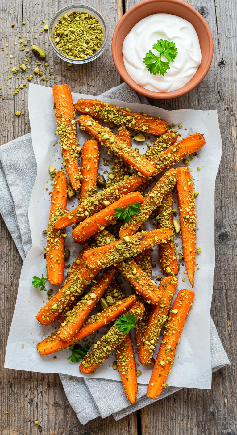 Bright, crunchy carrot fries coated in pistachios and spiced with za’atar — a vibrant, healthy snack with Middle Eastern flair.