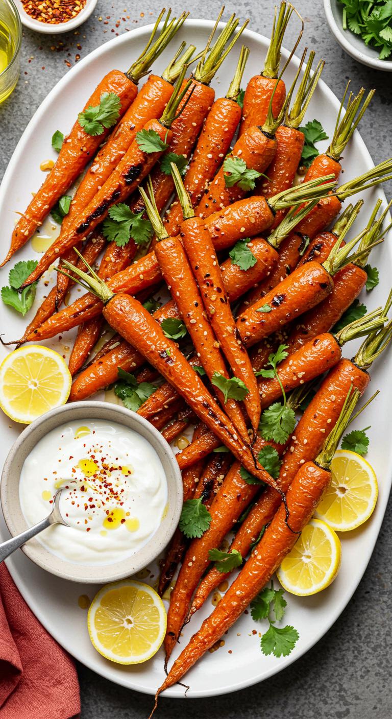 - Remove carrots from the oven and transfer to a serving platter. Drizzle or dollop with the yogurt sauce.