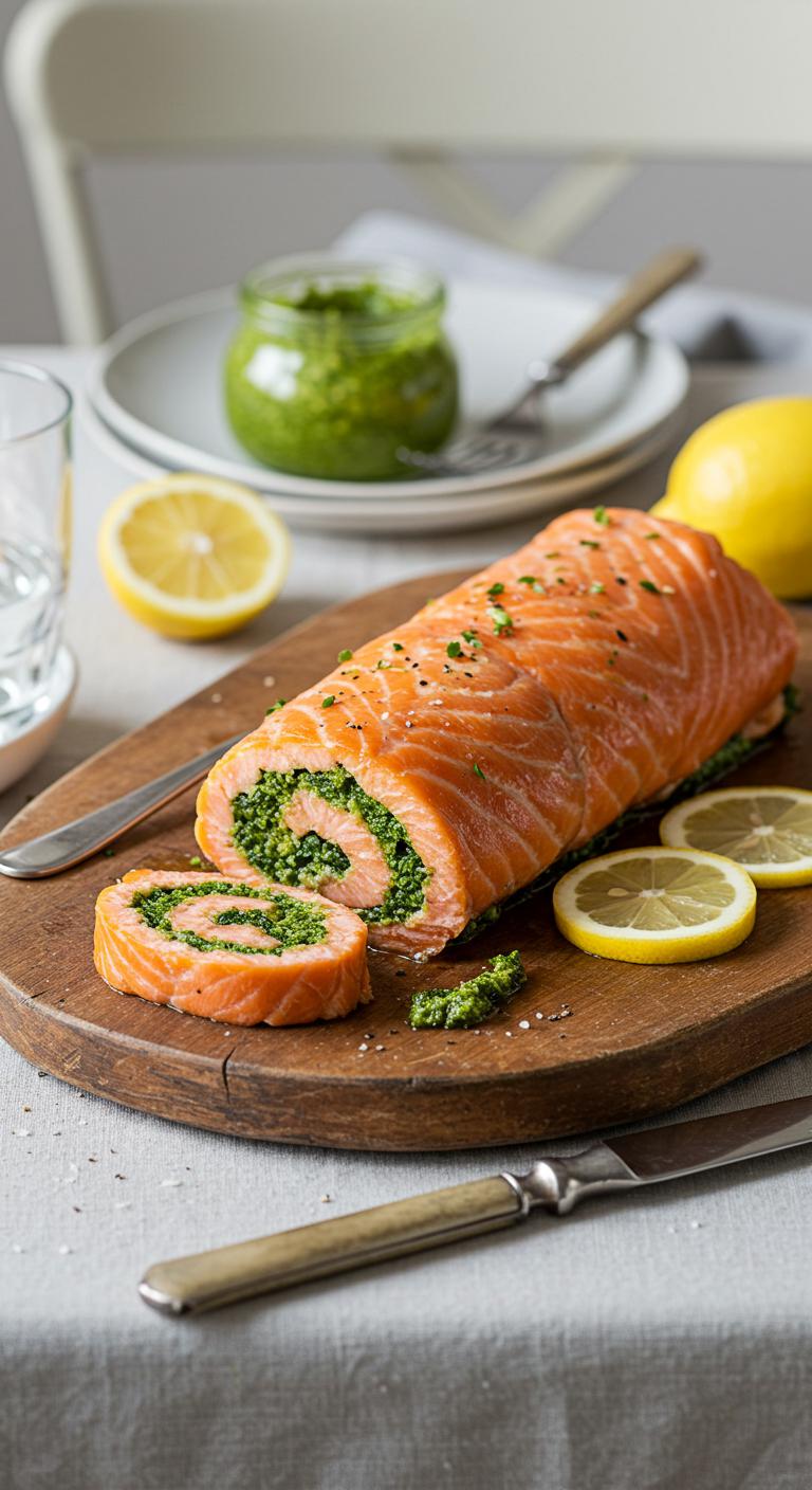 Pesto-Stuffed Salmon Roulade — a beautiful, savory centerpiece that’s as elegant as it’s easy.