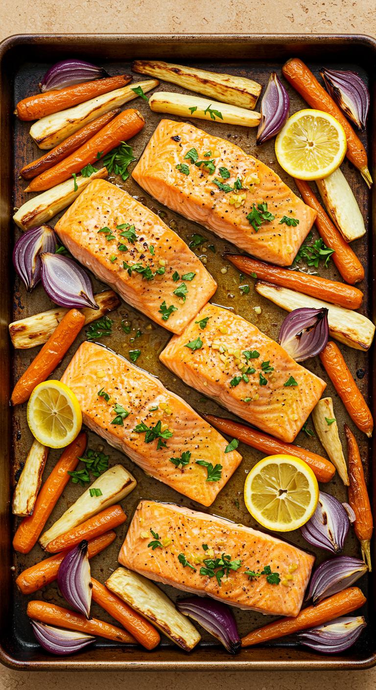 - Remove from oven, spoon any pan juices over the salmon and vegetables, and season with a final sprinkle of salt, pepper, and chopped parsley. Serve with lemon wedges.