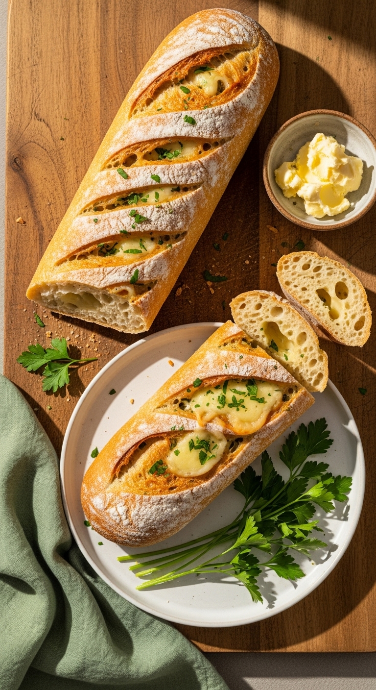 Slice warm with softened butter or serve with a light green salad. Sprinkle chopped parsley and a drizzle of olive oil. Store in an airtight bag 2 days at room temp or freeze slices for up to 2 months. Reheat in a toaster oven for oozy, melty bites. This bread pairs well with roasted vegetables or wine for dinner gatherings.