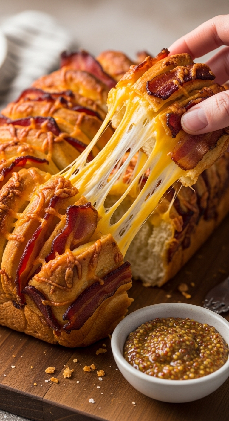 Place the filled loaf center table-side. Offer torn pieces of bread for dipping and bowls for run-off dip. Pair with grilled sausages or roasted vegetables. Store leftover dip and bread separately in the fridge 3 days. Reheat dip in the oven and freshen bread in the oven for 5–8 minutes. Ideal for cozy family dinners or casual gatherings.