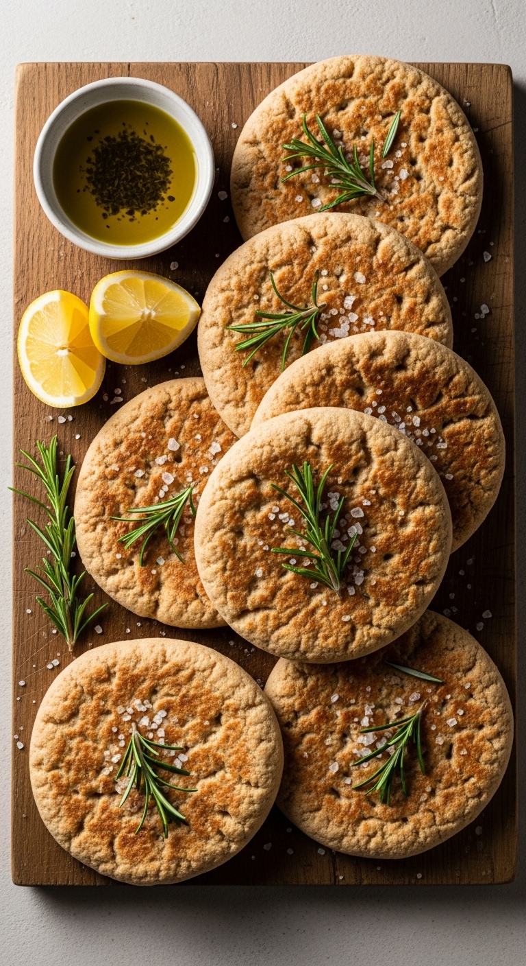 Tear into wedges for dipping in olive oil or serve as pizza bases. Top with roasted garlic and fresh greens for a light dinner. Store flatbreads covered at room temp 1 day, or freeze. Reheat in a hot skillet for crisp edges. These flatbreads work well for alfresco dinners and Mediterranean-inspired meals.