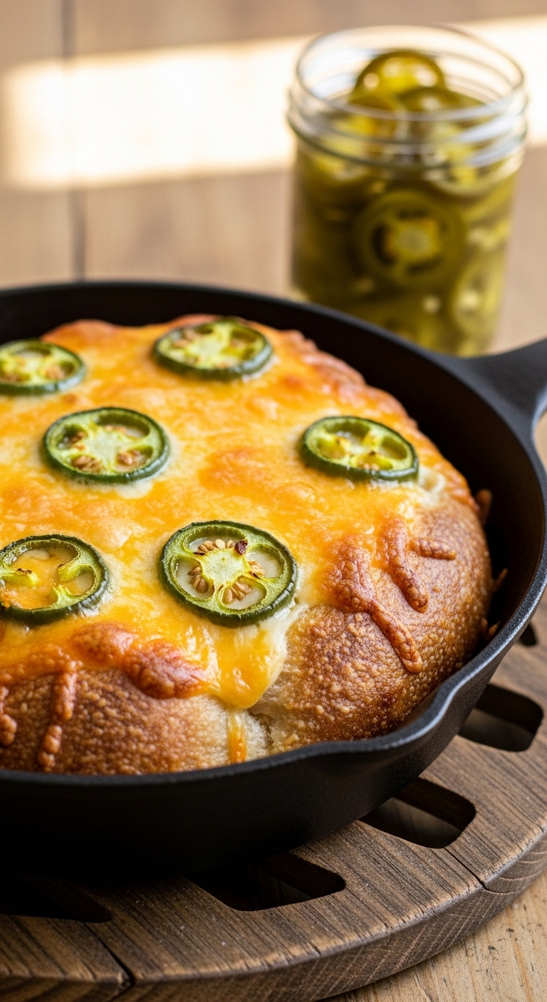 Cut into wedges and serve with chili, pulled pork, or a fresh slaw. Offer lime wedges and extra sliced jalapeños. Store wrapped at room temp 1–2 days. Reheat in oven to refresh crust. This skillet bread makes a bold addition to weeknight dinners and backyard parties.