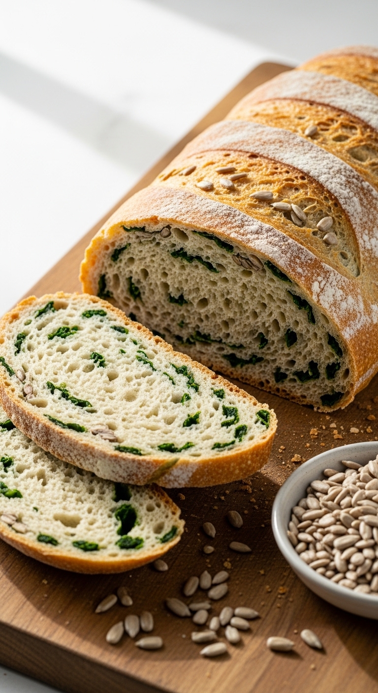 This spinach, feta, and sunflower seed sourdough batard is nutty and bright. Sunflower seeds add crunch; spinach gives color and freshness. It pairs well with lighter mains or a warm salad. The crumb is tender and speckled with green.