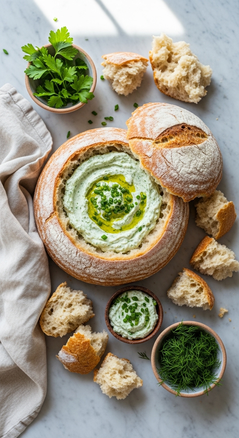 11. Rustic Sourdough Bread Bowl with Savory Herb Dip