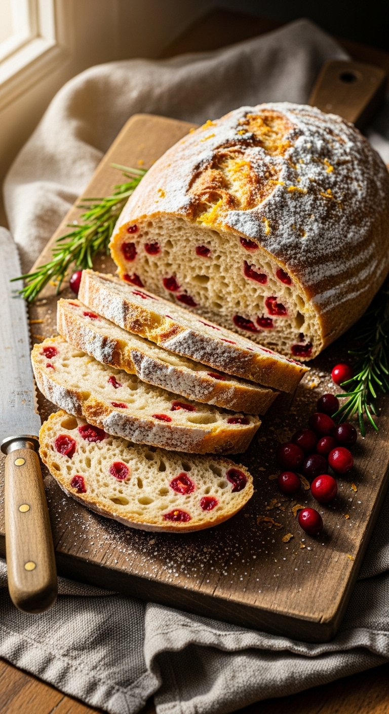 Serve slices warm with soft butter or brie and extra orange zest. Garnish platter with fresh rosemary sprigs and leftover cranberries. Pair with mulled wine or strong coffee. Store wrapped in a linen bag at room temp up to 48 hours, or freeze sliced for up to 3 months. Make-ahead: bake, cool completely, then freeze; toast slices straight from the freezer. Great for holiday brunch boards and edible gifts.