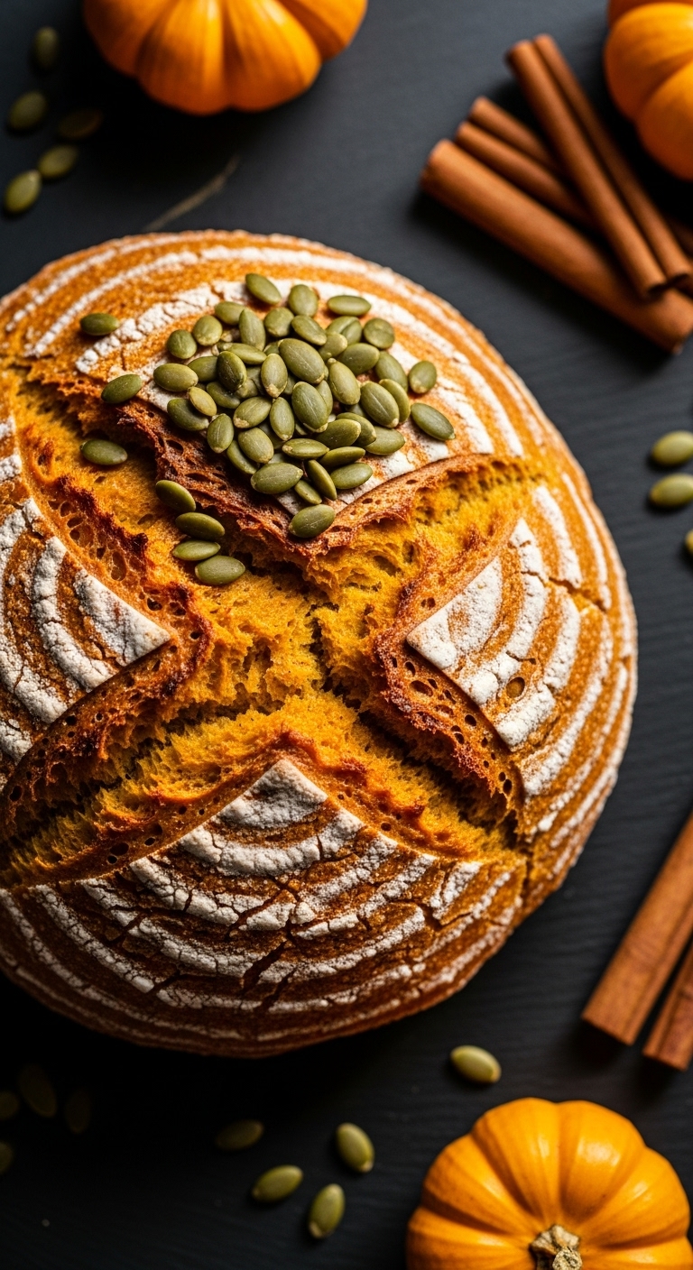 Serve toasted with honey butter or mascarpone and a sprinkle of cinnamon. Garnish with extra pepitas and a dusting of powdered sugar for a festive look. Pairs with spiced cider or latte. Store at room temp in a paper bag for up to 48 hours, or slice and freeze. Use stale slices for bread pudding spiced with apple and maple.