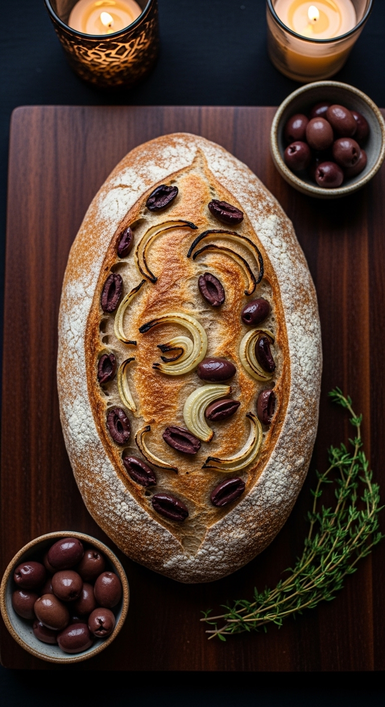 Serve alongside latkes, smoked fish, or a creamy dip. Garnish with fresh thyme and olive slices. Pair with crisp white wine or herbal tea. Store in a linen bag up to 2 days; freeze slices for sandwiches. Make-ahead: caramelize onions earlier in the week and fold in on bake day.