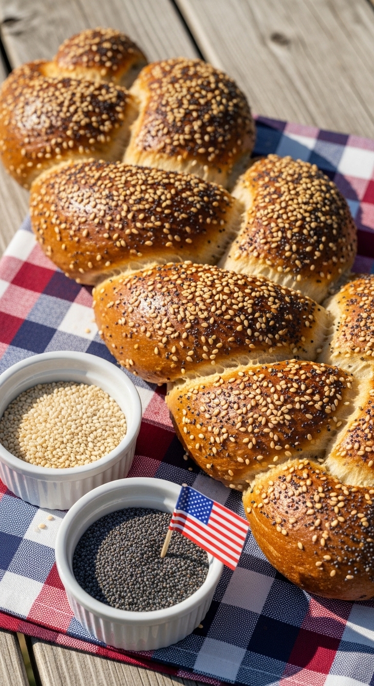 This seeded braid is festive, stunning, and perfect for a Fourth of July picnic. Three strands create a showy loaf you can slice for sandwiches. A mix of sesame, poppy, and flax gives crunch and flavor. You’ll get toasted seed aroma while it bakes and a glossy, pull-apart texture when sliced.