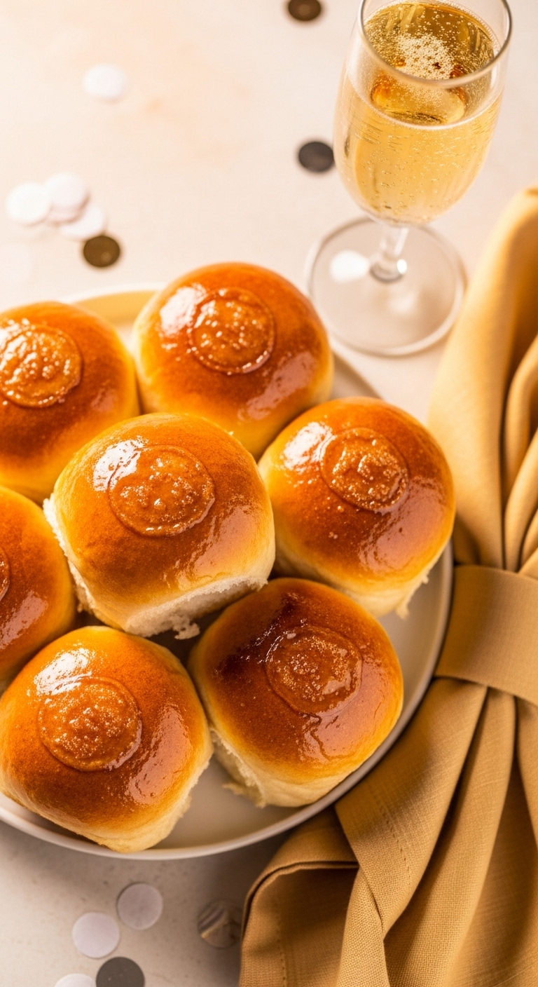 Serve warm with champagne butter or whipped honey butter. Garnish platter with edible gold leaf or fresh berries for flair. Pair with sparkling wine or cider. Store in an airtight container for 2 days, reheat gently. Make-ahead: freeze unbaked rolls and bake from frozen, adding 5–8 minutes.