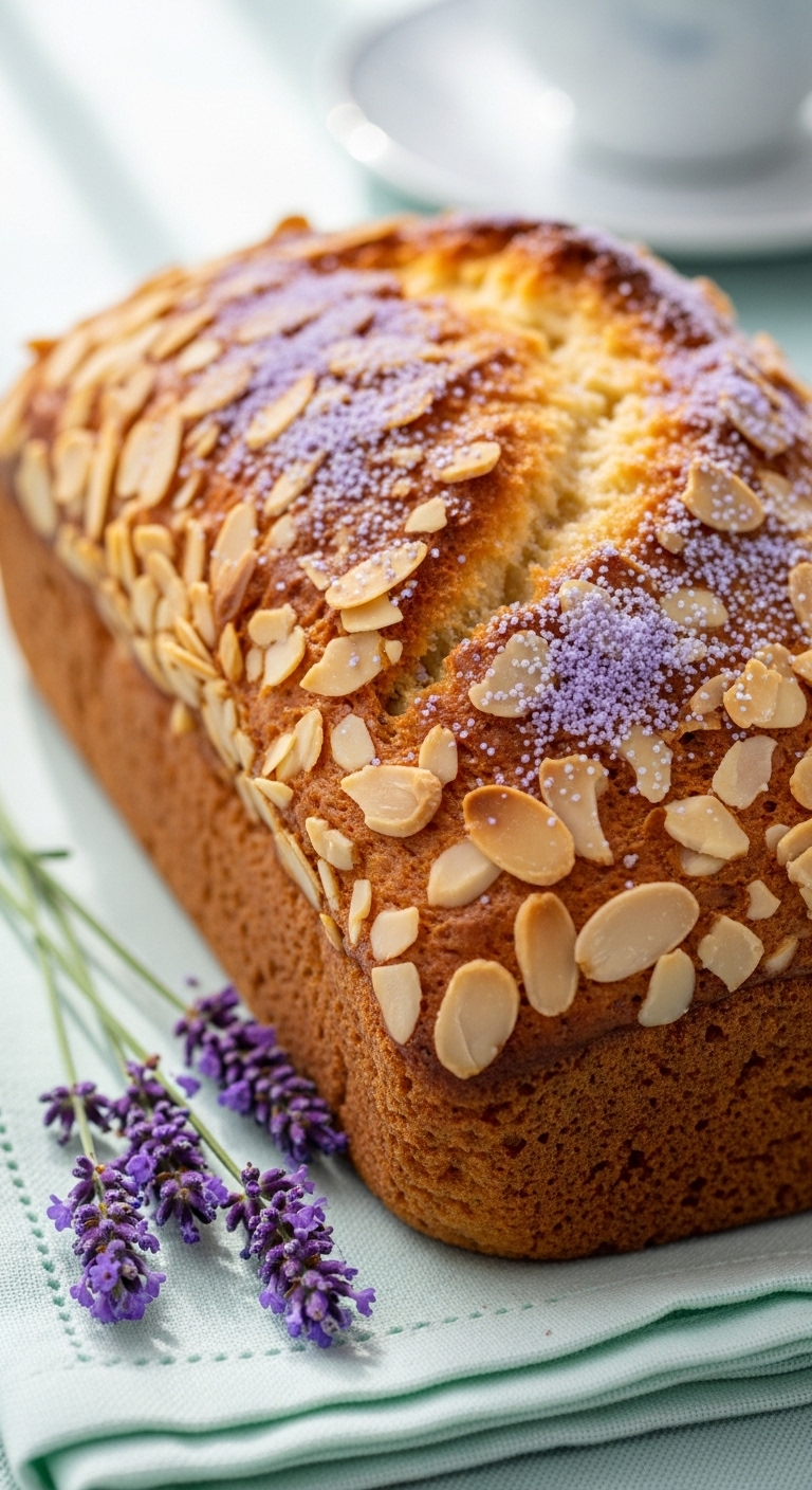 Serve thin slices with clotted cream or lemon curd. Garnish each plate with a tiny sprig of lavender and extra almonds. Pairs beautifully with Earl Grey tea or Champagne. Store wrapped in linen for 2 days, or freeze slices. Make-ahead: bake the night before and warm lightly before serving.