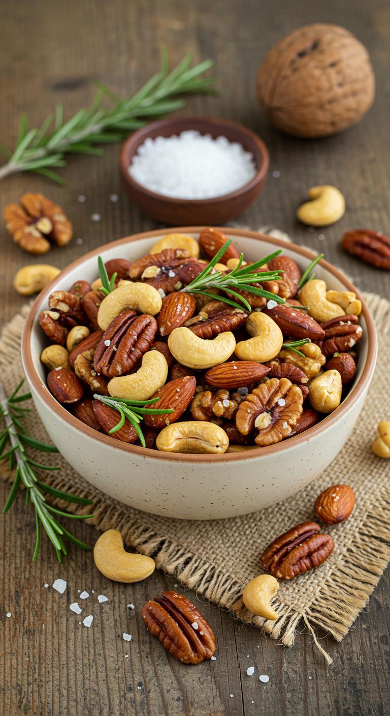 - In a bowl, toss the mixed nuts with olive oil, chopped rosemary, sea salt, pepper, and garlic powder and brown sugar if using.