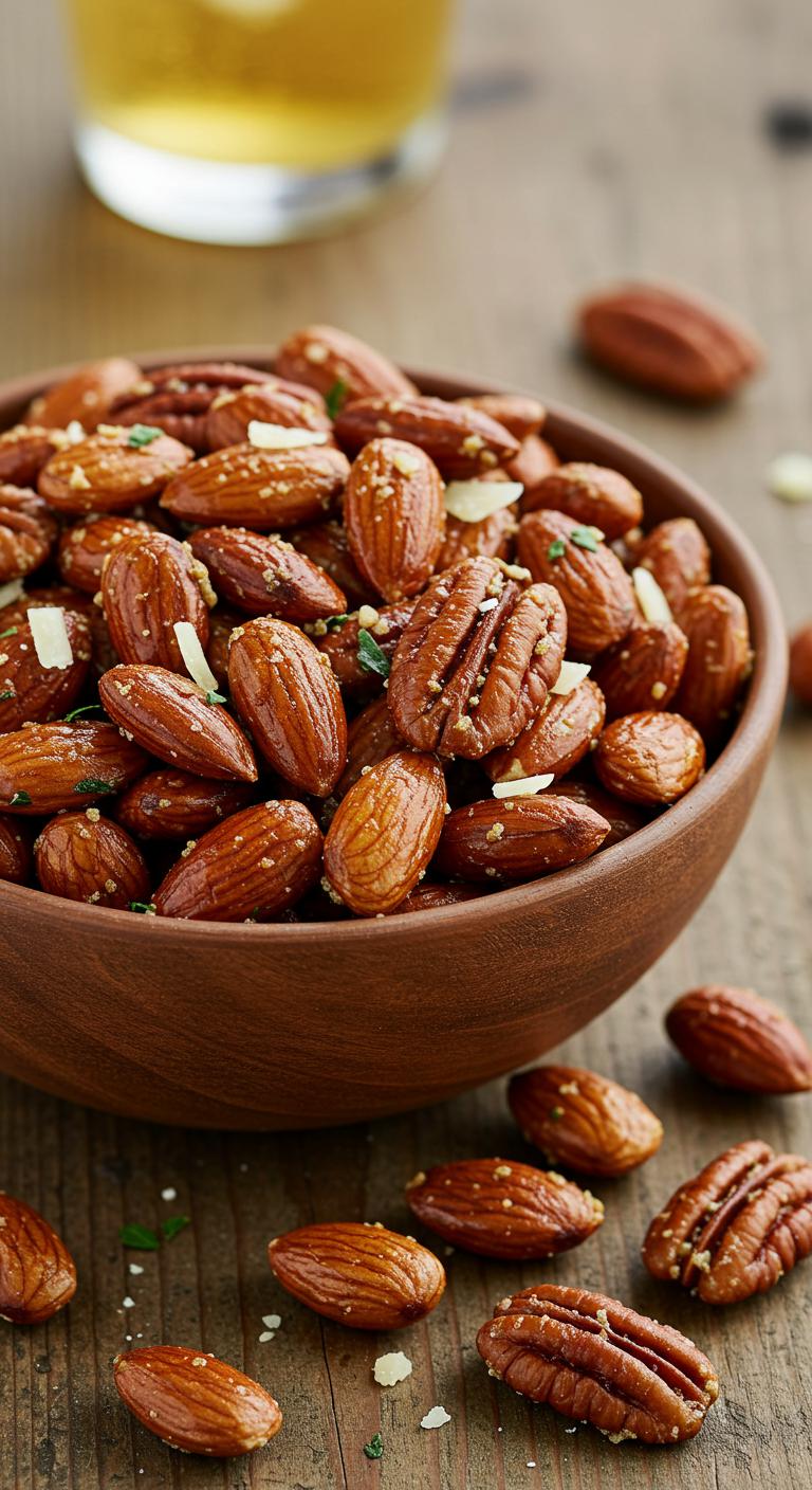 A crunchy, savory snack of almonds and pecans tossed in garlic, Parmesan, and a touch of herbs — perfect for munching or gifting.