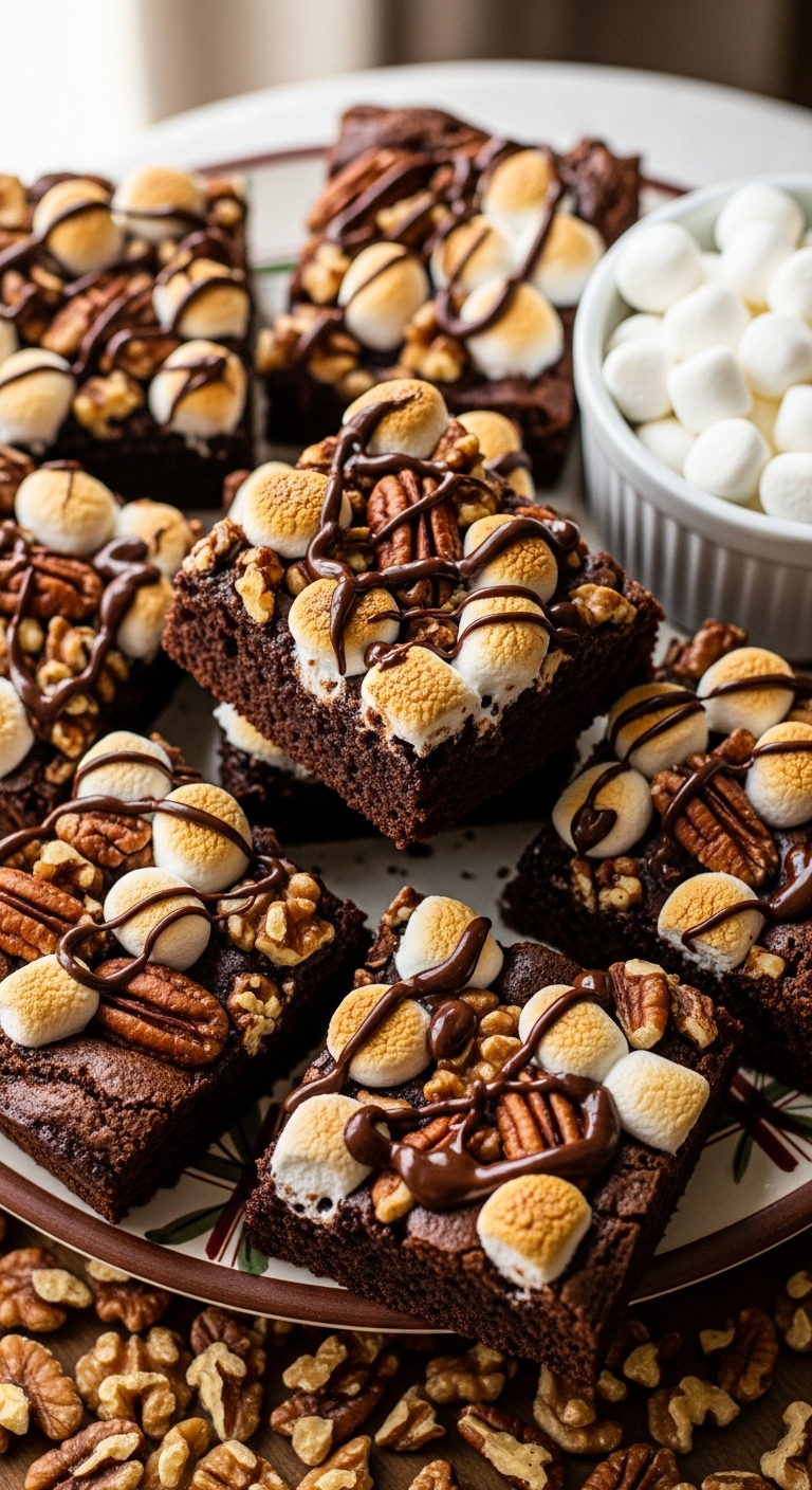Serve with an extra drizzle of melted chocolate and sprinkled nuts. Pair with milkshakes or hot chocolate. Store airtight at room temperature up to 2 days to keep marshmallows soft. For parties, cut into mini squares for a fun platter.