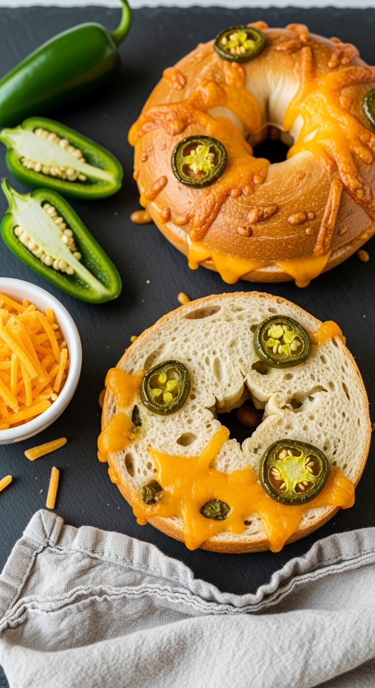 - Remove, top with extra cheddar and jalapeño slices, and bake 20–22 minutes until cheese is browned and bagels are glossy.