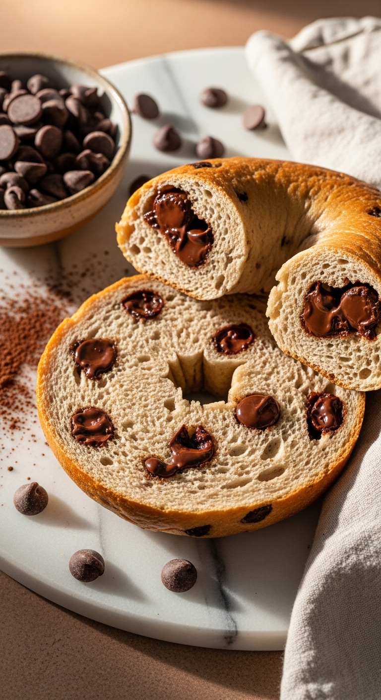 This sweet bagel uses discard for depth and slight tang that balances chocolate. Mini chocolate chips distribute evenly for melty pockets. Texture is tender with a chewy bite and bakery-style sweetness.