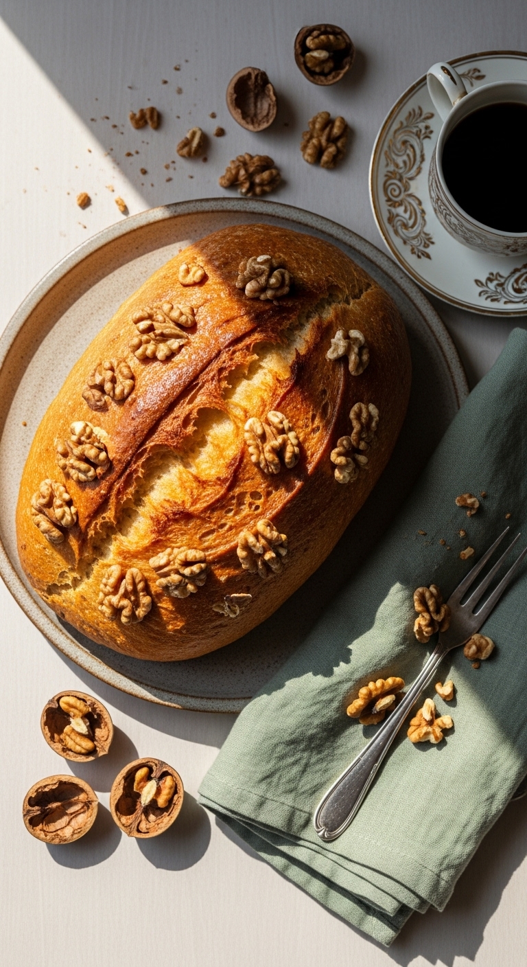 Slice and serve with cream cheese spread or ricotta and honey. Garnish with a few whole toasted walnuts. Pair with black coffee or a nutty tea. Keeps well wrapped in foil at room temperature for 2 days. Freeze slices in a single layer for quick breakfasts later.