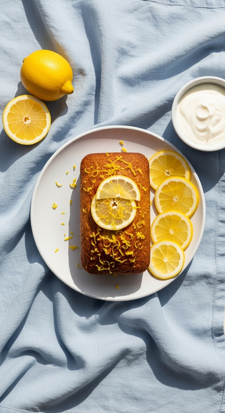Top slices with Greek yogurt and a few fresh berries. Garnish with lemon zest for brightness. Pair with iced coffee or herbal tea. Store in the fridge for 3–4 days due to berries, or freeze slices for up to 3 months.