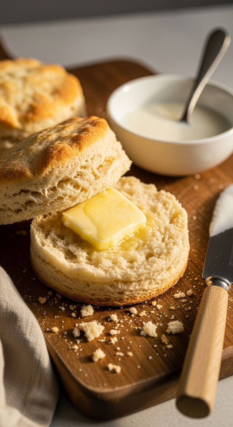 Serve on a wooden board, stacked with butter pats. Garnish with fresh chives for color. Pair with scrambled eggs or steak and gravy. Store cooled biscuits in an airtight container for 2 days, or freeze for 1 month. Reheat in oven at 350°F for 8–10 minutes. Make dough ahead and refrigerate for 30 minutes before baking.