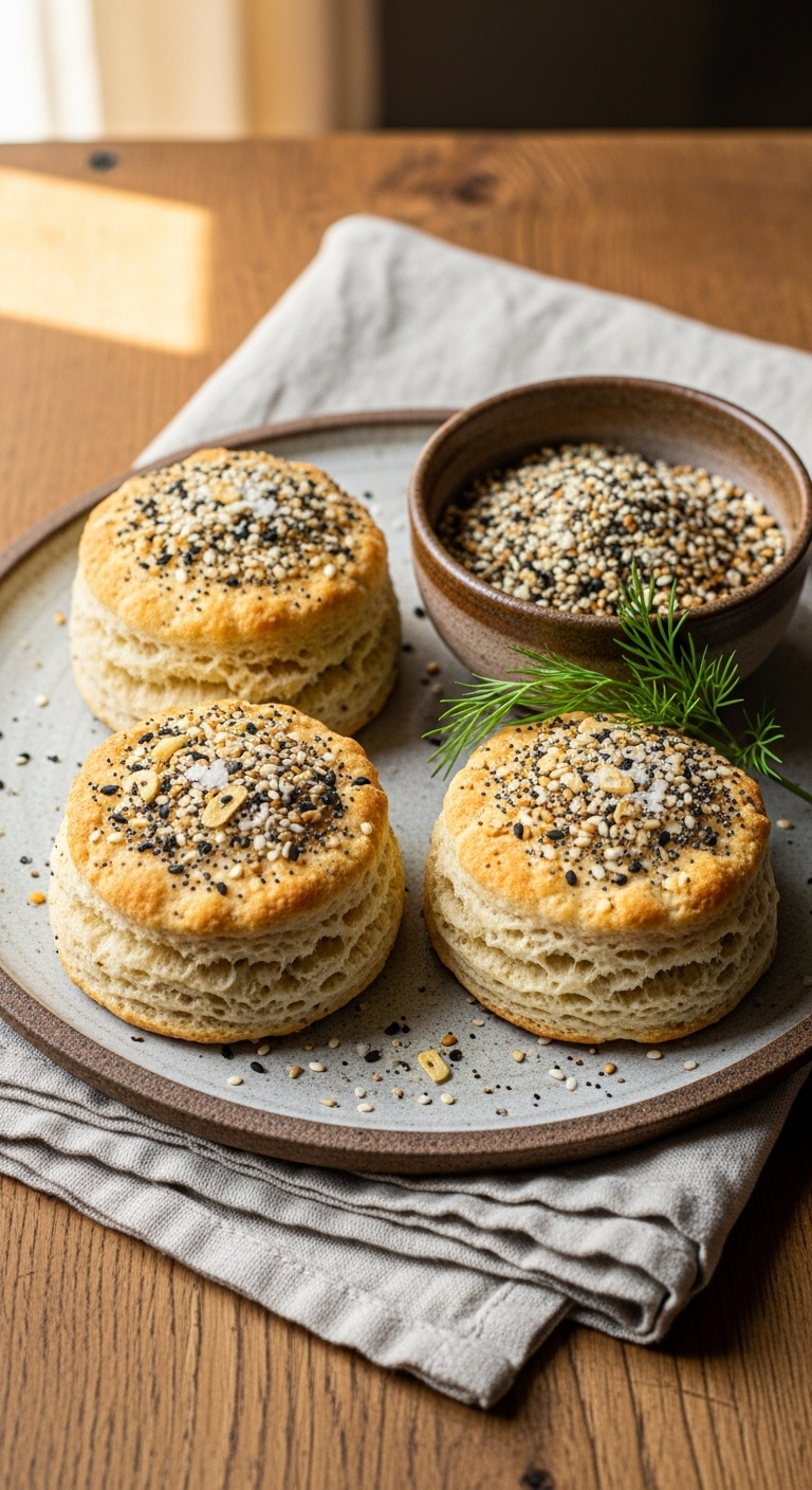 These biscuits get a bold crunch from everything seasoning. Sesame, poppy, and onion add savory pop to flaky layers. The sourdough discard gives a subtle tang that balances the seasoning. They pair great with smoked salmon or breakfast spreads. Expect aromatic seeds and a crisp, savory top.