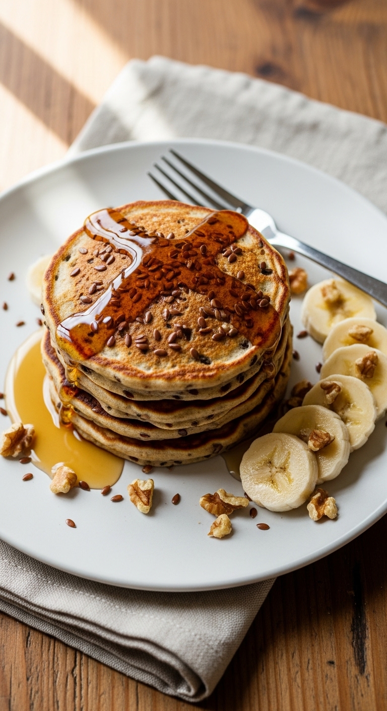Serve stacked pancakes with more sliced banana and a drizzle of maple syrup. Sprinkle extra chopped walnuts and a dusting of powdered sugar for a pretty finish. Pair with black coffee or a citrusy tea. Store cooled pancakes in an airtight container in the fridge up to 3 days. Reheat in a toaster or skillet. For make-ahead, freeze stacks between parchment sheets for up to 1 month.
