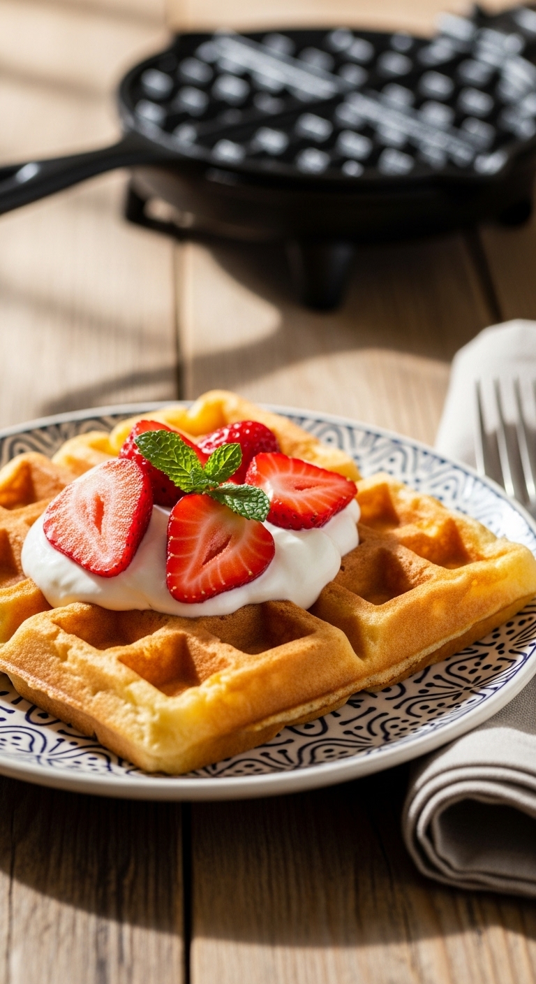 Top with Greek yogurt, fresh berries, and a drizzle of honey or maple syrup. Add a pat of cold butter and a sprinkle of toasted oats for crunch. Serve with a citrusy coffee or iced latte. Store cooled waffles in the fridge 2–3 days or freeze in single layers up to 1 month. Reheat in a toaster or oven for best texture.