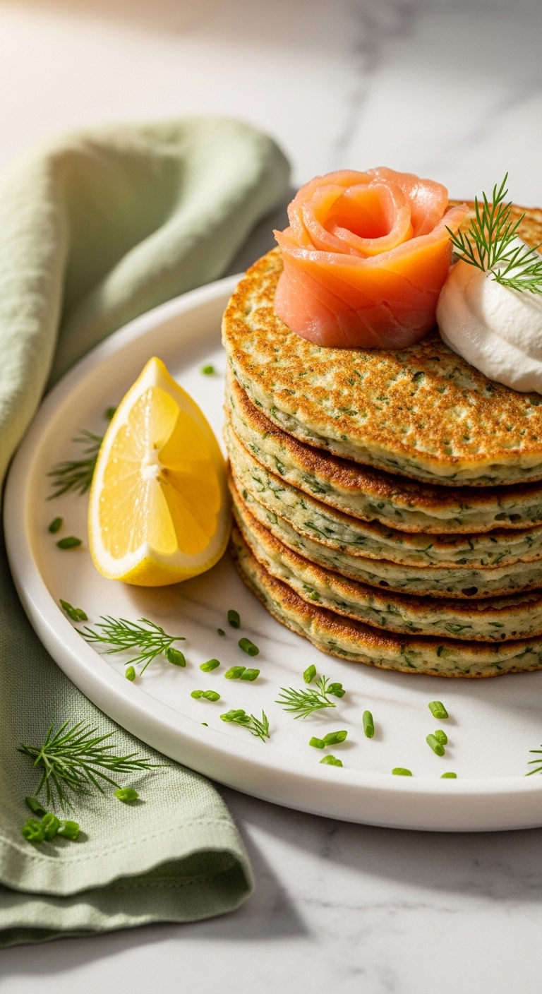 Layer pancakes with smoked salmon, crème fraîche, and capers for an elegant plate. Pair with sparkling wine or a strong black tea. Store leftover pancakes separated with parchment in the fridge 2 days. Reheat briefly in a skillet. These are beautiful for brunch parties or special mornings.
