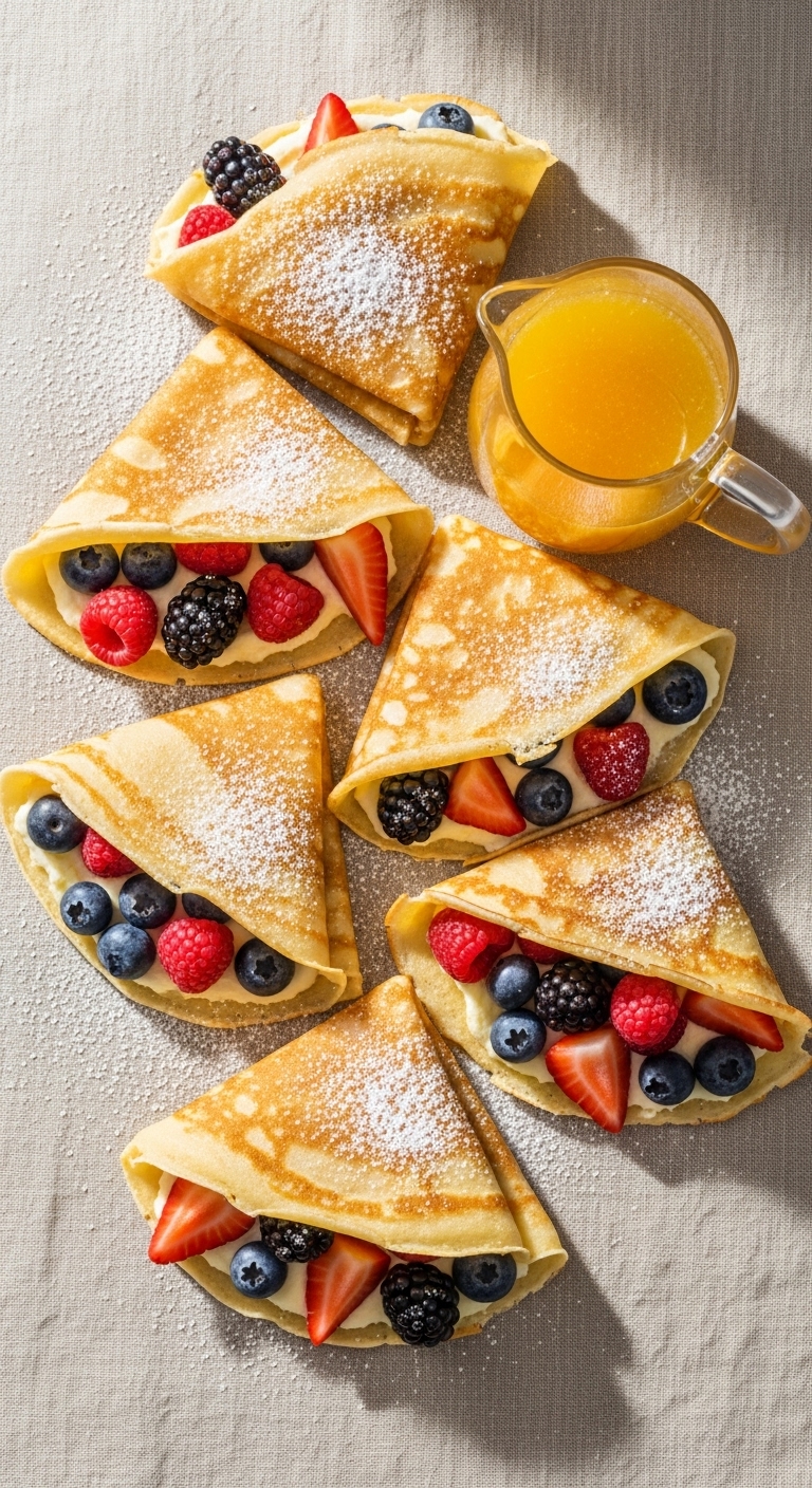 Fold crepes into triangles and top with extra berries and a lemon wedge. Pair with sparkling water or a citrusy tea. Make the ricotta filling ahead and refrigerate up to 2 days. Crepes freeze well — stack with parchment and freeze up to 1 month. Reheat gently in a skillet. If crepes stick, check skillet temperature and add a touch more butter.