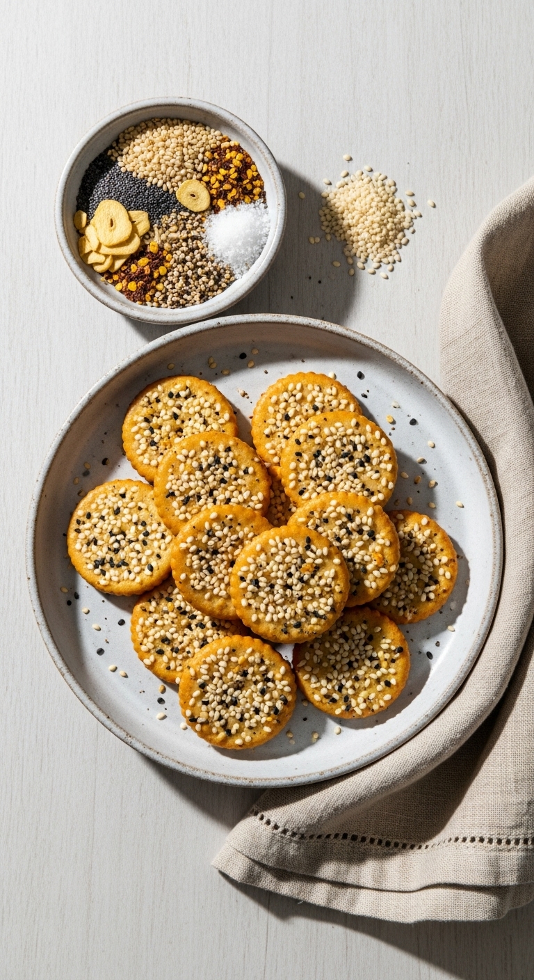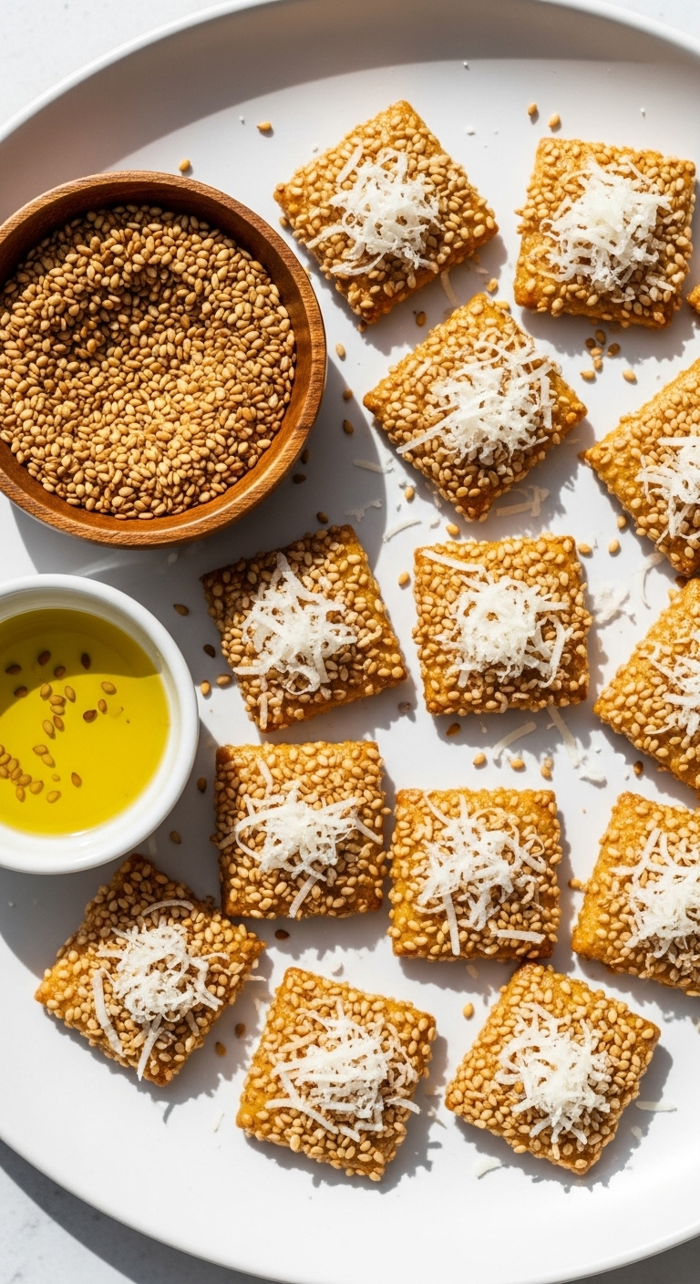Sprinkle over salads or serve with tzatziki or hummus. Garnish with extra sesame seeds and lemon zest for brightness. Store in an airtight container for up to 5 days. These mini crackers freeze well; re-toast briefly to re-crisp.