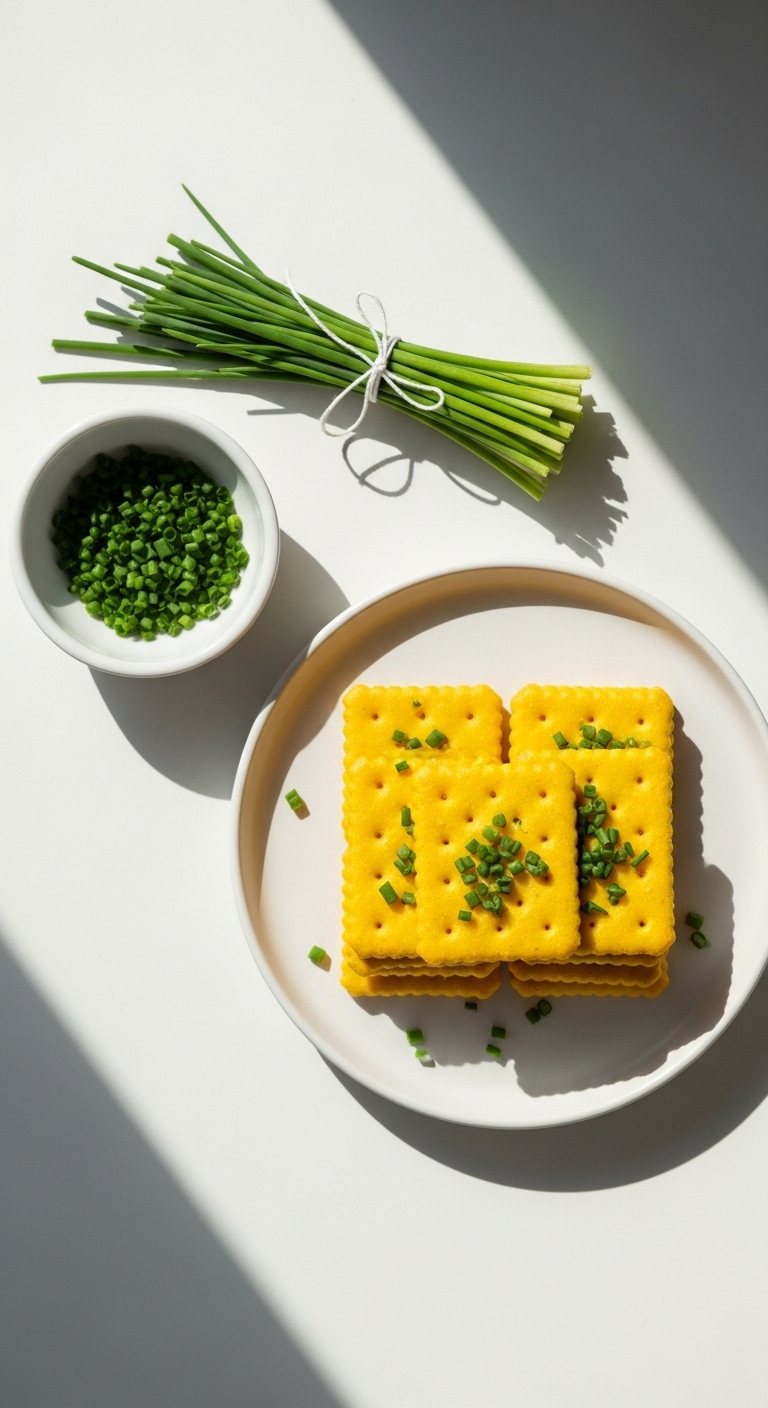 Chives add brightness to these sourdough discard Cheez Its, turning a classic into something herby and fresh. The flavor is cheesy with delicate onion notes. Texture is crisp with tender centers. These work well with dips or as a garnish for soups and salads.