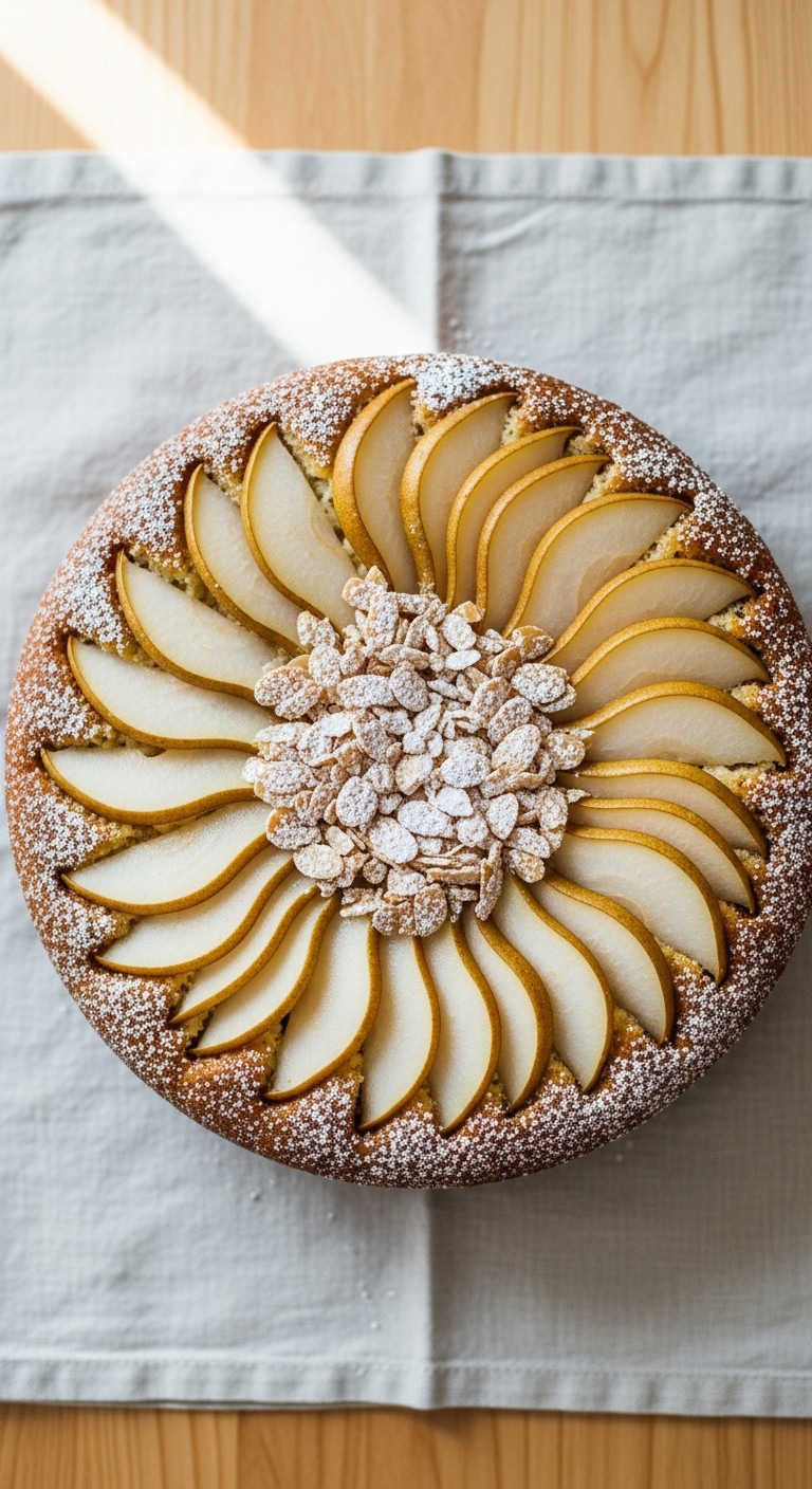 This cake is lovely for brunch with friends or a special weekend. Expect delicate pear sweetness and a nutty finish.