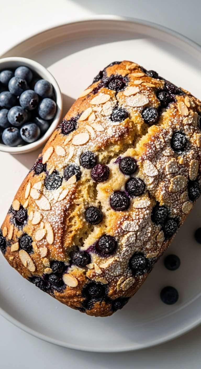 Serve slightly warm with a smear of mascarpone or plain Greek yogurt. Garnish with extra fresh blueberries and a few almond slivers. Pair with iced coffee or a fruity tea. Store covered for 2–3 days or freeze slices individually.